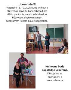 UPOZORNĚNÍ!!! 0 V pondělí 13. 10. 2025 bude knihovna otevřena pouze od 12:30 hod. do 17:00 hod. Knihovna Aktuality