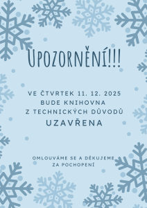 UPOZORNĚNÍ!!! 0 V pondělí 13. 10. 2025 bude knihovna otevřena pouze od 12:30 hod. do 17:00 hod. Knihovna Aktuality